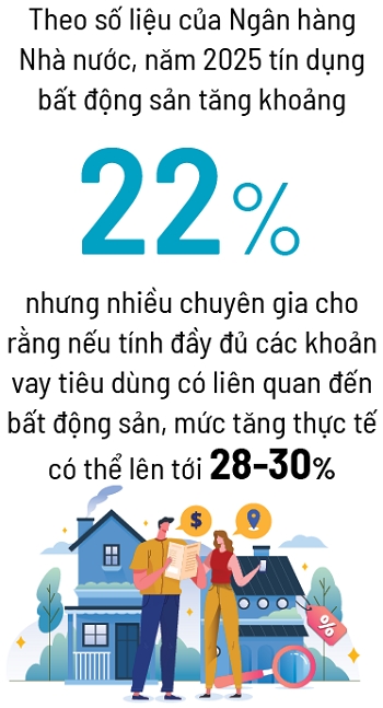 Trong hơn 10 năm qua, động lực phát triển của các doanh nghiệp bất động sản Việt Nam chủ yếu dựa trên mô hình “đòn bẩy tài chính kép”. Theo đó, tín dụng ngân hàng làm lõi: vốn vay thường chiếm tới 70-80% tổng vốn đầu tư dự án. Tốc độ tăng trưởng tín dụng bất động sản thường xuyên đạt mức 20-25%, cao hơn nhiều so với mức chung của nền kinh tế.