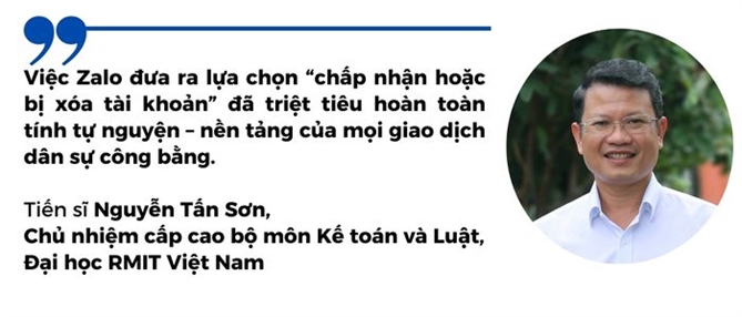 Việc Zalo đưa ra lựa chọn “chấp nhận hoặc bị xóa tài khoản” đã triệt tiêu hoàn toàn tính tự nguyện, nền tảng của mọi giao dịch dân sự công bằng. Khi Zalo đã trở thành hạ tầng liên lạc thiết yếu của xã hội Việt Nam, từ giao tiếp cá nhân, kinh doanh đến trao đổi công việc, thì việc đe dọa cắt quyền sử dụng dịch vụ để buộc người dùng chia sẻ dữ liệu cá nhân có thể bị xem là lạm dụng vị thế áp đảo để khai thác quyền riêng tư.