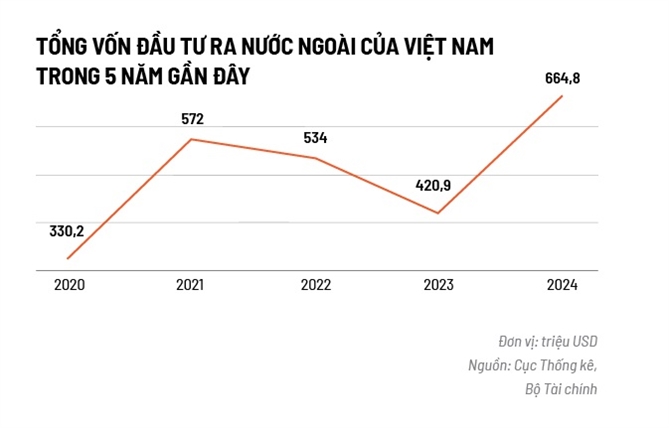 Dữ liệu gần đây khẳng định sự chuyển dịch này là có chủ đích. Sau mức thấp nhất 330,2 triệu USD vào năm 2020 do ảnh hưởng của đại dịch và bất ổn địa chính trị, tổng vốn đầu tư ra nước ngoài của Việt Nam đã tăng lên đỉnh điểm 664,8 triệu USD vào năm 2024.