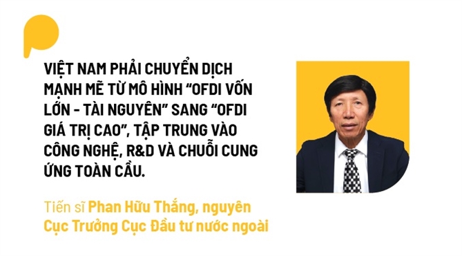 Về vấn đề này, Tiến sĩ Phan Hữu Thắng, nguyên Cục Trưởng Cục Đầu tư nước ngoài, khuyến nghị Việt Nam phải chuyển dịch mạnh mẽ từ mô hình “OFDI vốn lớn - tài nguyên” sang “OFDI giá trị cao”, tập trung vào công nghệ, R&D và chuỗi cung ứng toàn cầu.