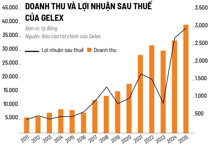 Các thương vụ M&A đình đám giúp quy mô của Tập đoàn phình to nhanh chóng, doanh thu cũng vì thế mà tăng vọt cơ học trong thời gian ngắn. Dữ liệu tài chính cho thấy doanh thu của Gelex tỷ lệ thuận với các giai đoạn hợp nhất công ty con. Từ 8.6392 tỉ đồng doanh thu thuần năm 2015, đến năm 2025 con số này đã là 39.512 tỷ đồng, với CAGR đạt 16,78% trong giai đoạn 2015-2025. Lợi nhuận sau thuế hợp nhất cũng tăng từ 455 tỉ đồng lên hơn 2.900 tỷ đồng, CARG đạt 20,55%.