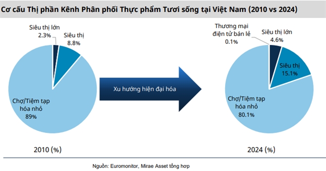 Báo cáo của Công ty Chứng khoán Mirae Asset cho thấy, cơ cấu kênh phân phối thực phẩm tươi sống tại Việt Nam đang dần chuyển dịch theo hướng hiện đại hóa. Thị phần kênh truyền thống (chợ, tiệm tạp hóa nhỏ) tuy vẫn chiếm ưu thế với 80% năm 2024, nhưng đã giảm 9% so với năm 2010 (ở mức 89%). Ngược lại, kênh hiện đại gần như tăng gấp đôi thị phần, từ 11% lên 20%, nhờ sự mở rộng nhanh của chuỗi siêu thị mini/ siêu thị lớn. Xu hướng này phản ánh rõ sự thay đổi trong hành vi tiêu dùng, khi người dân ưu tiên hơn cho chất lượng, an toàn và tiện lợi.