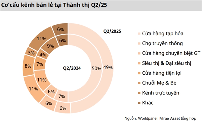 Thị trường FMCG tại các thành phố dịch chuyển rõ rệt sang các kênh hiện đại. Tỉ trọng của cửa hàng tiện lợi (tăng từ 7% lên 8%) và các kênh trực tuyến (tăng từ 9% lên 11%), cho thấy người tiêu dùng ngày càng ưu tiên sự tiện lợi và khả năng mua sắm nhanh tại các kênh hiện đại. Ngược lại, các chợ truyền thống và cửa hàng nhỏ lẻ tiếp tục thu hẹp thị phần, phản ánh sự thay đổi trong hành vi mua sắm khi người tiêu dùng. Sự mở rộng nhanh của các chuỗi hiện đại mang lại cơ hội cho các thương hiệu FMCG tăng độ phủ, mở rộng nhóm khách hàng và tối ưu kích thước giỏ hàng.