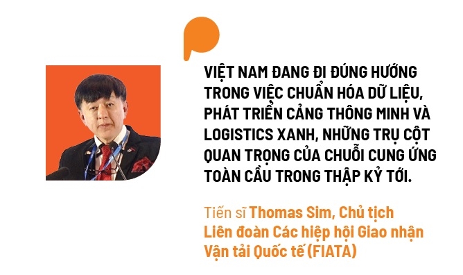 “Việt Nam đang đi đúng hướng trong việc chuẩn hóa dữ liệu, phát triển cảng thông minh và logistics xanh, những trụ cột quan trọng của chuỗi cung ứng toàn cầu trong thập kỷ tới”, Tiến sĩ Thomas Sim, Chủ tịch Liên đoàn Các hiệp hội Giao nhận Vận tải Quốc tế (FIATA), đánh giá. Ông cho rằng, Việt Nam cần nắm bắt 6 cơ hội: trở thành trung tâm đa phương thức thông minh của ASEAN; tăng tốc hội nhập thương mại số quốc gia; xây dựng các khu thương mại tự do và công viên logistics sẵn sàng cho tương lai; dẫn đầu ASEAN về logistics xanh; nắm bắt sự bùng nổ của thương mại điện tử xuyên biên giới và phát triển lực lượng lao động logistics đẳng cấp thế giới.