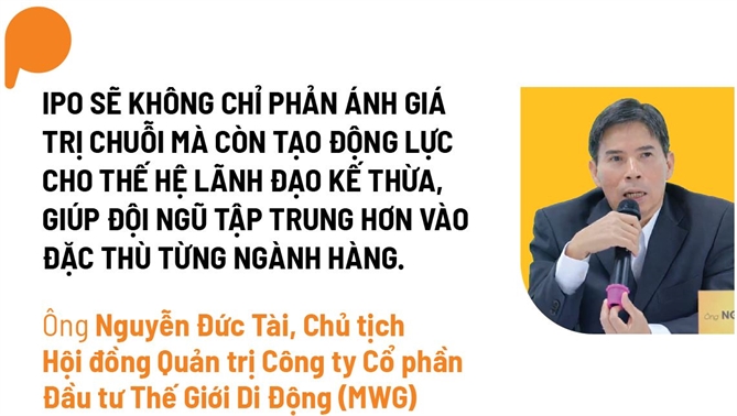 Ông Nguyễn Đức Tài, Chủ tịch Hội đồng Quản trị MWG, chia sẻ IPO sẽ không chỉ phản ánh giá trị chuỗi mà còn tạo động lực cho thế hệ lãnh đạo kế thừa, giúp đội ngũ tập trung hơn vào đặc thù từng ngành hàng. Các chuỗi mà Tập đoàn đang vận hành có nhiều điểm chung về kiến thức quản trị, tuyển dụng, đào tạo và hệ thống hỗ trợ, nhưng sản phẩm lại hoàn toàn khác biệt “như tivi và con cá vốn không có nhiều liên hệ”.