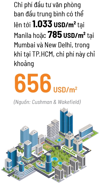 Ông Nguyễn Phước Thuận, Giám đốc Bộ phận Cho thuê Cushman & Wakefield Việt Nam, cho biết, Việt Nam đang có lợi thế cạnh tranh trong việc thu hút các trung tâm năng lực toàn cầu (GCC). Việt Nam còn có lợi thế chi phí đầu tư ban đầu cạnh tranh hơn so với Ấn Độ và Philippines. Theo báo cáo của Cushman & Wakefield, chi phí đầu tư văn phòng ban đầu trung bình có thể lên tới 1.033 USD/m² tại Manila hoặc 785 USD/m² tại Mumbai và New Delhi, trong khi tại TP.HCM, chi phí này chỉ khoảng 656 USD/m².