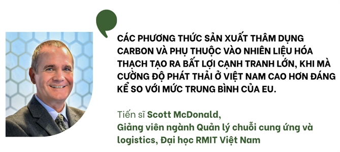 Tiến sĩ Scott McDonald, Giảng viên ngành Quản lý chuỗi cung ứng và logistics tại Đại học RMIT Việt Nam, nhận định rằng sự thâm dụng carbon và mức độ phụ thuộc lớn vào nhiên liệu hóa thạch đang tạo ra bất lợi cạnh tranh đáng kể cho Việt Nam. Thực tế cho thấy cường độ phát thải trong sản xuất tại thị trường nội địa đang cao hơn mức trung bình của EU. Điều này đồng nghĩa với việc các hoạt động tiêu tốn nhiều năng lượng sẽ trực tiếp làm tăng chi phí carbon cho mỗi đơn hàng rời cảng sang châu Âu.