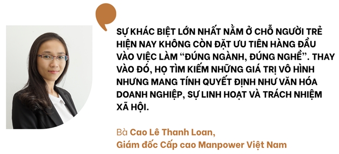 Bà Cao Lê Thanh Loan, Giám đốc Cấp cao Manpower Việt Nam, nhận định nhận định rằng sự khác biệt lớn nhất nằm ở chỗ người trẻ hiện nay không còn đặt ưu tiên hàng đầu vào việc làm “đúng ngành, đúng nghề”. Thay vào đó, họ tìm kiếm những giá trị vô hình nhưng mang tính quyết định như văn hóa doanh nghiệp, sự linh hoạt và trách nhiệm xã hội.