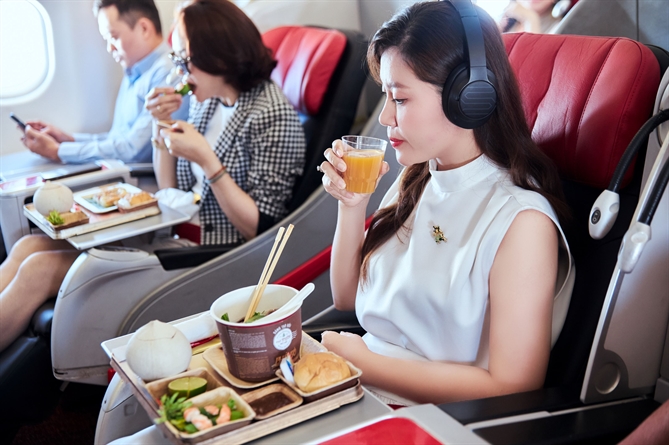 Trên không, khoang ghế da cao cấp, bố trí riêng, tạo nên một không gian yên tĩnh, dễ chịu. Trải nghiệm bay được nâng đỡ bằng dịch vụ ẩm thực nóng tươi, phong phú và thực dưỡng, phục vụ không giới hạn với những món ăn đặc trưng quen thuộc, được nhiều hành khách yêu thích như Phở, Bún bò Huế, Bánh mì, cà phê sữa, matcha… Mỗi bữa ăn không chỉ đáp ứng nhu cầu, mà còn mang theo hương vị thân quen và cảm giác được chăm sóc trong suốt hành trình.