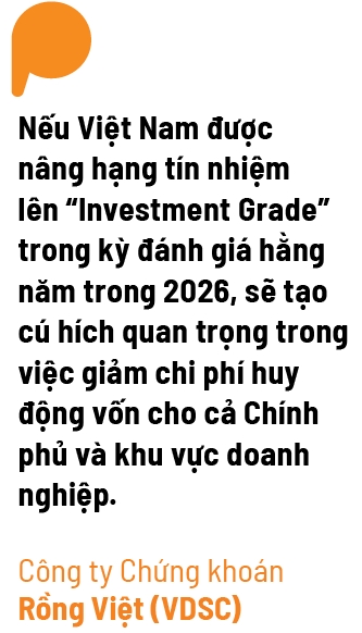 “Nếu Việt Nam được nâng hạng tín nhiệm lên “Investment Grade” trong kỳ đánh giá hằng năm trong 2026 sẽ tạo cú hích quan trọng trong việc giảm chi phí huy động vốn cho cả Chính phủ và khu vực doanh nghiệp”, Công ty Chứng khoán Rồng Việt (VDSC) nhận định.
