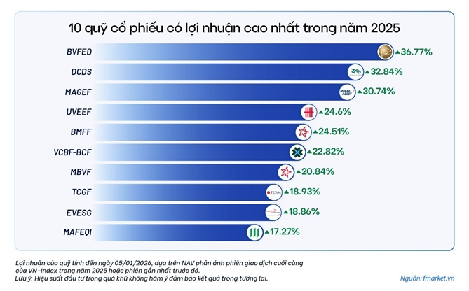 Dữ liệu thống kê từ Fmarket cho thấy, những quỹ cổ phiếu có sự linh hoạt trong vận hành danh mục đạt được mức sinh lời ấn tượng trong năm 2025 với lợi nhuận trên 30%, tiêu biểu như BVFED (36,77%), DCDS (32,84%) và MAGEF (30,74%). Ngoài ra, danh sách các quỹ có lợi nhuận tốt nhất năm nay còn có quỹ UVEEF (24,6%), BMFF (24,51%), VCBF-BCF (22,82%), MBVF (20,84%), TCGF (18,93%), EVESG (18,86%), MAFEQI (17,27%).