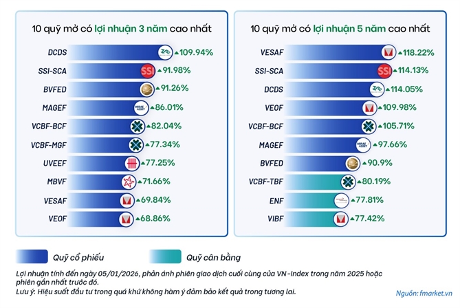 Dữ liệu trong giai đoạn 5 năm cho thấy, nhóm quỹ có hiệu suất cao nhất đạt mức lợi nhuận bình quân khoảng 15-22%/năm. Đáng chú ý, các quỹ dẫn đầu lợi nhuận dài hạn vẫn là những cái tên quen thuộc như VINACAPITAL-VESAF, DCDS, SSI-SCA, BVFED, MAGEF hay VCBF-BCF. Sự lặp lại này không mang tính ngẫu nhiên, mà phản ánh năng lực quản lý danh mục, quy trình đầu tư kỷ luật và khả năng thích ứng bền bỉ của các quỹ này qua nhiều chu kỳ thị trường.