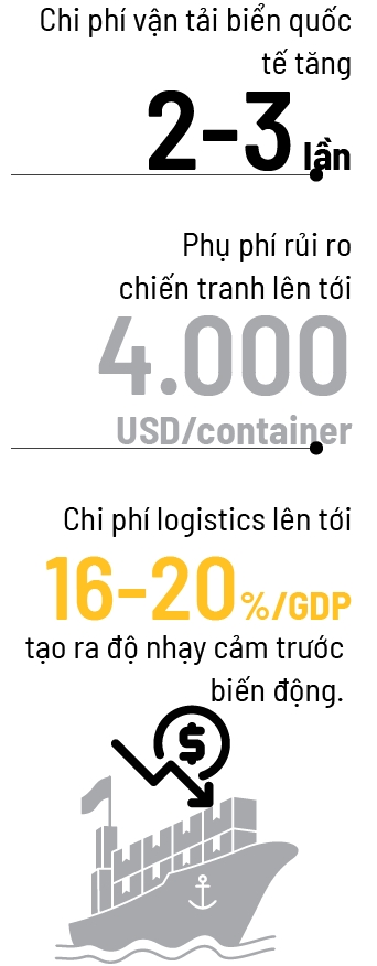 Sự bất ổn tại khu vực Trung Đông đã buộc các tuyến vận tải biển quốc tế từ Việt Nam đi Mỹ và châu Âu phải thay đổi lộ trình, kéo dài hành trình thêm từ 14-20 ngày để tránh vùng chiến sự. Hệ quả là giá dịch vụ vận tải biển trên các tuyến chủ lực từ TP.HCM đi UAE, Mỹ và châu Âu đã tăng phi mã từ 2-3 lần. Bên cạnh giá cước, các doanh nghiệp còn phải gánh thêm “phụ phí rủi ro chiến tranh” dao động từ 2.000-4.000 USD cho mỗi container.