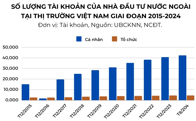 Trên thực tế, nhà đầu tư nước ngoài vẫn luôn tham gia tích cực ở thị trường chứng khoán Việt Nam, điều này một phần thể hiện ở số lượng tài khoản chứng khoán của nhóm nhà đầu tư này liên tục tăng trong những năm qua. Dữ liệu từ Ủy ban Chứng khoán Nhà nước cho thấy, năm 2015 thị trường Việt Nam chỉ có khoảng 17.800 tài khoản của nhà đầu tư nước ngoài, đến tháng 8/2024, số lượng tài khoản của nhà đầu tư nước ngoài đã vượt 47.000 với sự tăng trưởng cả của nhà đầu tư cá nhân nước ngoài và tổ chức nước ngoài.