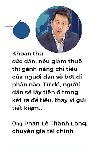 Khi đầu tư công đang cho thấy sự suy yếu thì việc thúc đẩy tiêu dùng cũng trở thành một trong những động lực quan trọng. Đây còn được coi là chính sách khoan sức dân thông qua việc giảm thuế, giảm gánh nặng cho người dân. Theo chuyên gia tài chính Phan Lê Thành Long, “khoan thư sức dân”, nếu giảm thuế thì gánh nặng chi tiêu của người dân sẽ bớt đi phần nào. Từ đó, người dân sẽ lấy tiền ở trong két ra để tiêu, thay vì gửi tiết kiệm. Khi người dân chịu chi tiêu sẽ giúp doanh nghiệp có được dòng thanh khoản.
